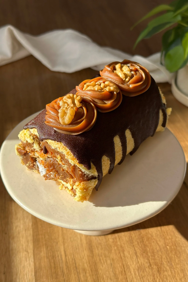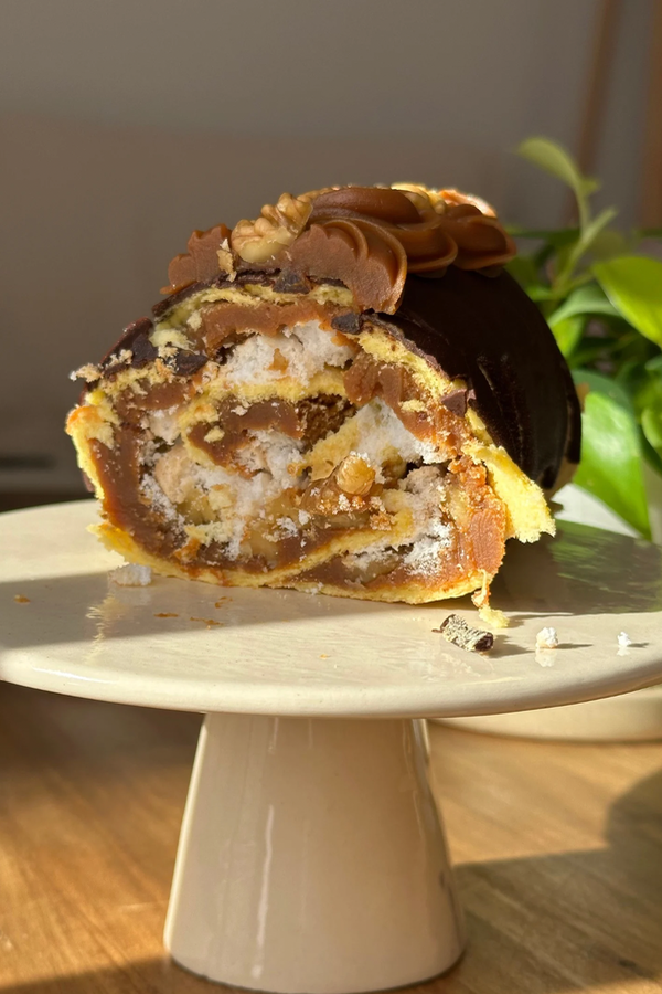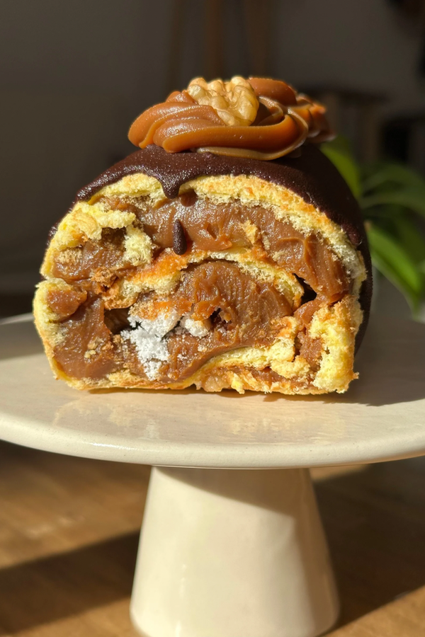 Este pionono es una bomba: masa tipo pan nube, rellena con dulce de leche keto , merenguitos y nueces crocantes. Bañado en chocolate 80%. Es un viaje de ida 🤤💛 Sin harinas, sin azúcar y con TODO el sabor a diciembre 🎄