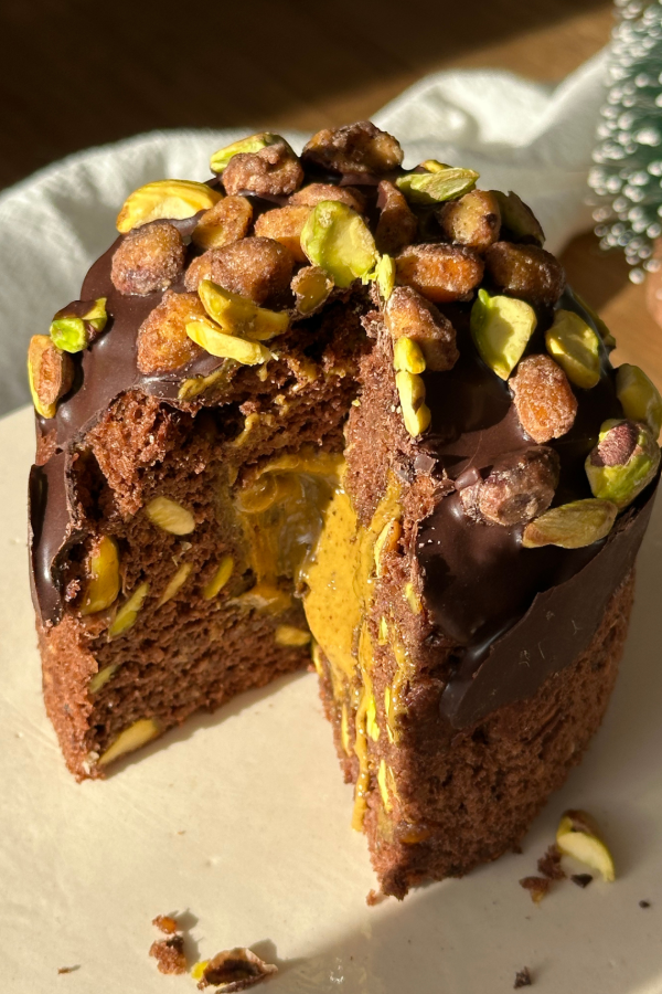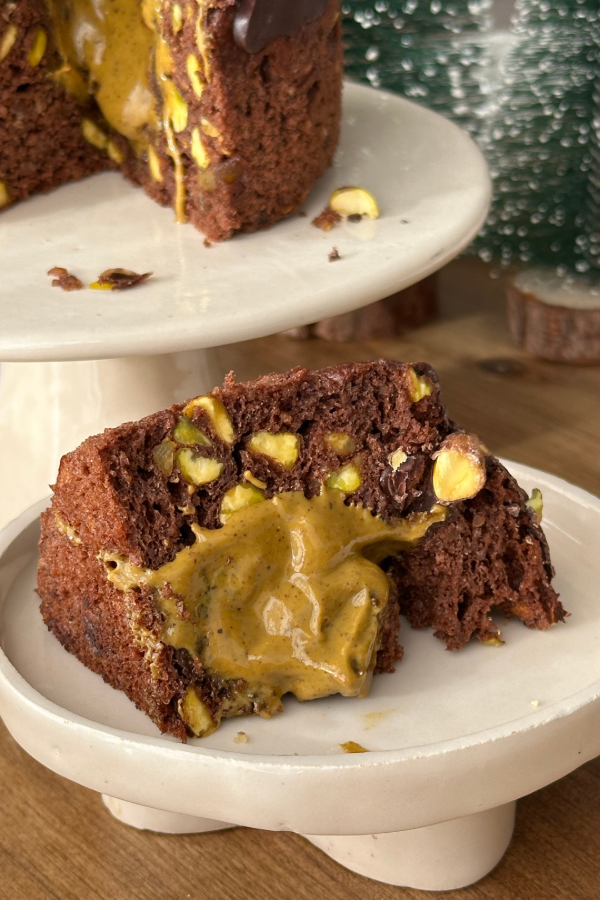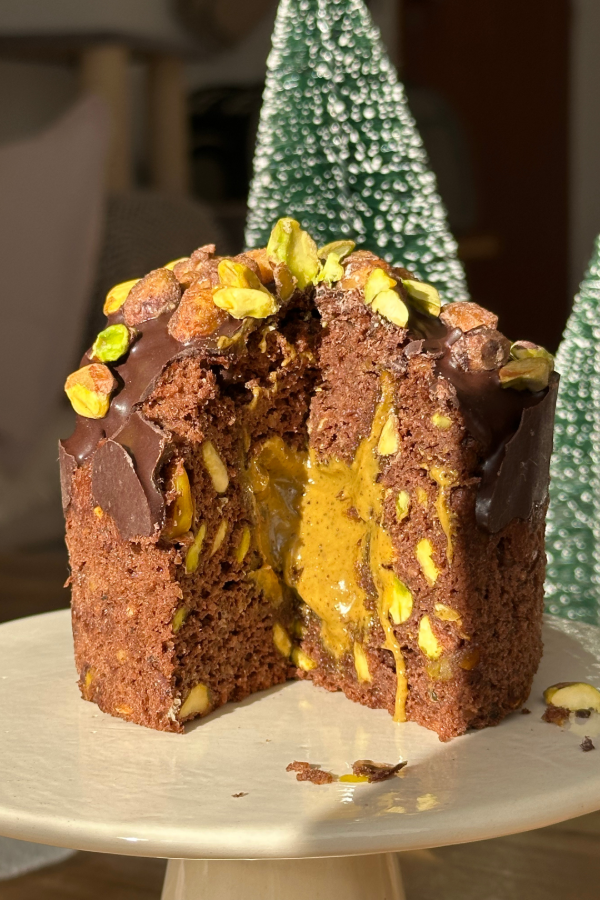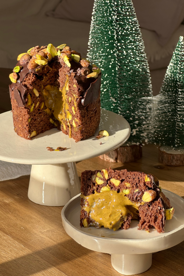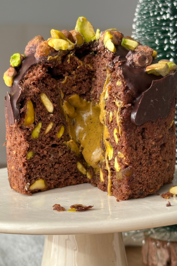 Ingredientes: Pistachos, Agua, Pasta de pistachos, Huevos, Harina de almendras, Xilitol, Chocolate 80% cacao, Eritritol, Cacao amargo, Harina de lino dorado, Aceite de coco, Levadura seca, Psyllium, Goma xantica, Sal del Himalaya, Vinagre de manzana, Agua de azhar, Esencia de pan dulce, Jengibre, Ralladura de limón