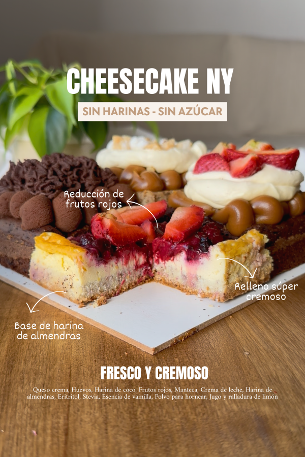 Cheesecake NY: base de harina de almendras, relleno cremoso y reducción de frutos rojos.