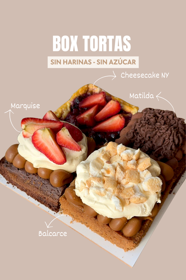 Nuestra Box incluye 4 tortas keto en versión degustación de un piso - todas sin harinas, sin azúcar y elaboradas con ingredientes de la más alta calidad