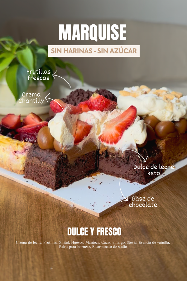 Marquise: chocolate, dulce de leche keto, crema y frutillas.